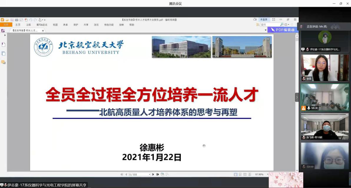学院党委副书记金鑫老师对人才培养大会精神进行了解读,指出北航要全员全过程全方位培养一流人才,促进学生德智体美劳全面发展。人才培养要在传承中把握好变与不变,在再塑中构建高质量人才培养体系,贯彻三全育人方针。全员育人要做好导向、导行、导心三方面;全方位育人要把握好授课课堂,用金课、金师、金教程打造一流专业,要把握好科研课堂,从科研导师、实验室开放日、微课题三个维度做好科研工作,要把握好社会课堂,丰富学生实习经验;全过程育人要做到本硕博贯通培养,从招生考试、资格考试、开题报告、预答辩、学位审核、导学关系等方面着手,实现人才培养的连续性。