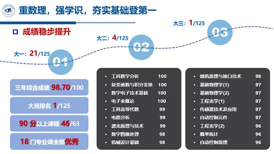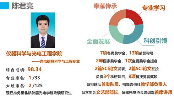 大学三年,综合成绩达98.34,7门核心课程成绩超过97分。共获得包括2年国家奖学金等各类奖学金共7项,荣誉证书共20项,被授予学院本科生最高荣誉——仪器光电之星称号。