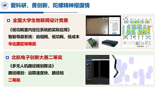 积极参与科技创新,获全国大学生物联网设计竞赛华北赛区特等奖、北航电创二等奖;面向“健康中国2020”战略,与首医合作完成光声成像检测动物血管项目,获冯如杯二等奖及同仁医院医学应用;正在进行用于测量颅内微小震动的激光多普勒测振仪研究,发扬陀螺精神,传承报国之志。