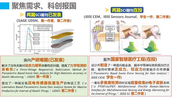 服务国家智慧医疗工程,在医疗电子领域已有2篇SCI论文(一作、二作)发表,另有2篇SCI论文(学生一作、二作)在投,并在IEEE-NSENS 2019国际会议上做英文报告,获与会专家一致好评。曾获全国大学生光电设计全国决赛二等奖(排名一)等9项科技竞赛奖项。以上科研成果已与361°、上海韦尔半导体展开合作讨论,即将前往国家康复辅具研究中心进行临床实验。