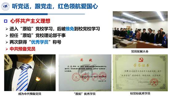 中共党员。一心向党,积极组织北航学生党支部组织力大赛、学院暑假党员集中学习等活动;思想引领,参演学院话剧《永恒》、校毕晚影舞《相约北航》;榜样先行,担任仪器光电协会副部长,主推朋辈辅导,实现学院冯如杯成绩大幅提升;关心班团建设,带领小班多次获得“优良学风班”、“标兵团支部”等荣誉。