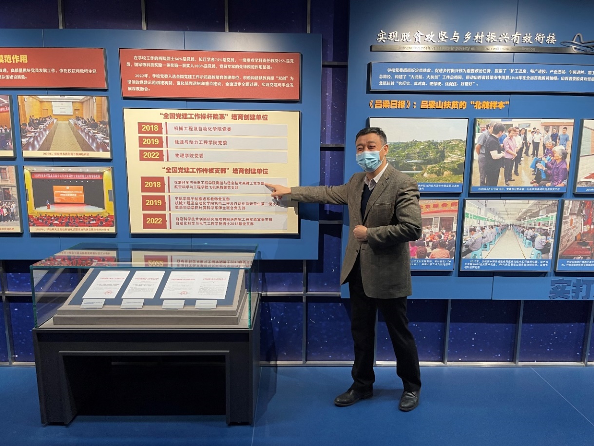 在二十大胜利闭幕和建校70周年庆祝活动之际,为加深教职工对北航发展历程和文化底蕴的了解,传承空天报国精神,积极投身学校建设事业,11月9日下午,365英国上市公司测控系教工党支部与马克思主义学院基础教研部教工党支部联合组织了参观北航校史馆学习日活动。365英国上市公司徐立军院长、曹章副院长和马克思主义学院基础教研部党支部书记付丽莎等同志参加了学习活动。
