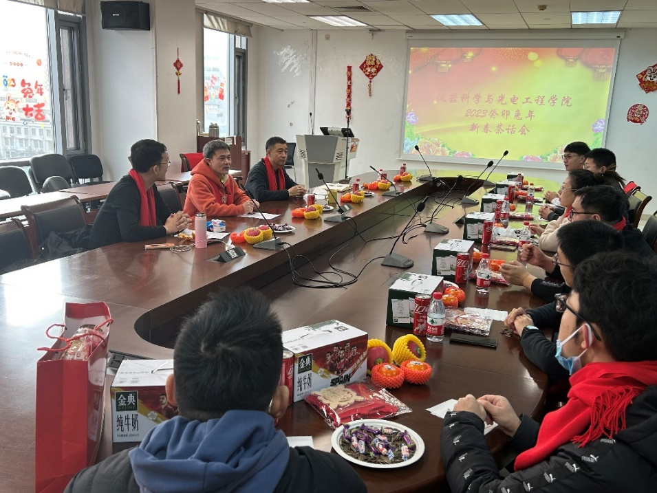 上午10时,留校学生新春茶话会正式开始。唠家常,聊心愿,谈心得,在随和温馨的氛围中,学院领导认真聆听每一位同学的发言,关心大家的学习、科研、春节安排,详细了解大家的困难与需求,并不时送上自己的解答与建议。