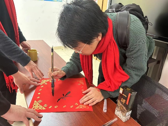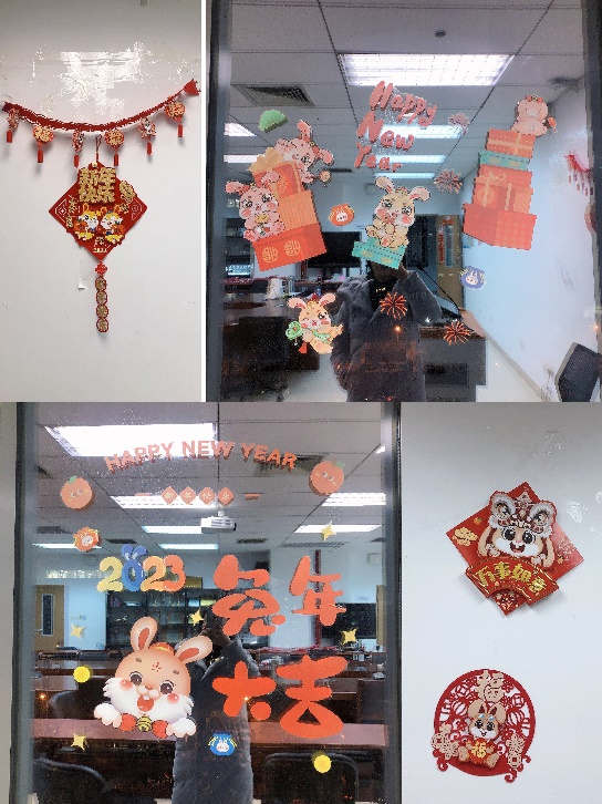 新主楼B707,“福兔贺岁”的对联孕育着宏福好运,“兔年大吉”的窗花温馨而又可爱,欢快的乐曲烘托着快乐的心情,红围巾、大礼包、心想事“橙”的柑橘,“苹”安喜乐的红富士,张灯结彩,喜气洋洋。