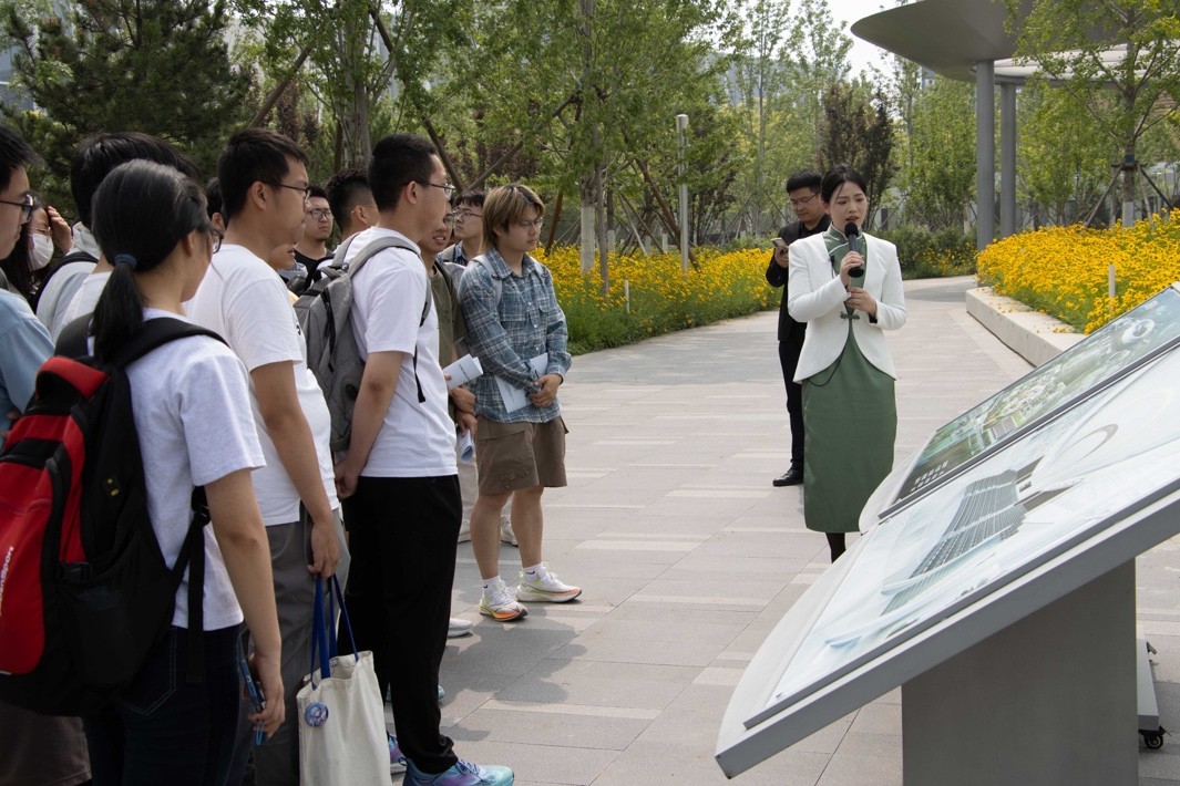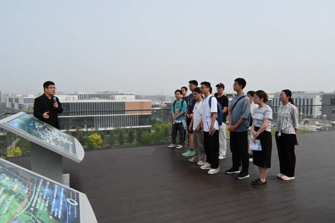 随后,同学们前往物理所材料基因组交叉研究平台进行参观。物理所地处怀柔科学城核心区,同学们登上观景平台俯瞰整个园区的科学设施,聆听企业导师讲解怀柔科学城建设进展情况。
