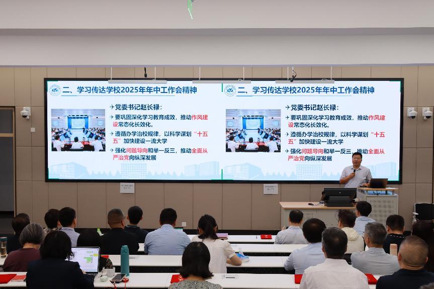 表彰大会后,学院召开秋季学期首次全院教师大会。会议学习传达学校2025年年中工作会精神,对秋季学期重点工作进行部署,并对党风廉政、师德师风、安全保密和质量及中秋国庆期间安全等工作提出具体要求。
