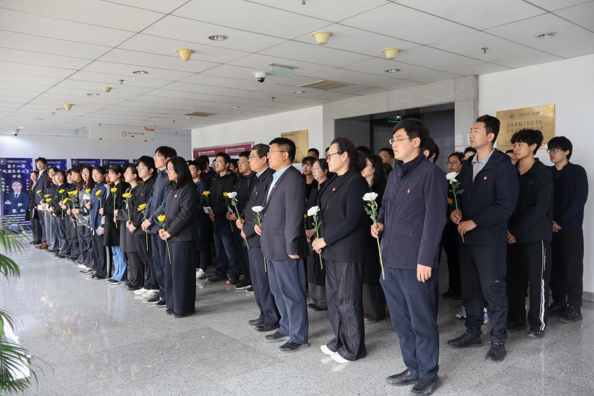 2026年4月3日中午,365英国上市公司与士谔书院师生代表于新主楼B座林士谔先生纪念像前庄严集会,共同举办清明追思活动,深切缅怀我国航空自动控制学科和陀螺惯导学科的奠基人、北航建校元老林士谔先生,重温其科学报国的光辉历程,传承其“爱国、创新、奉献”的陀螺精神。林士谔先生亲传弟子、士谔书院院长、仪器光电学院教授樊尚春、党委书记雷晓锋、党委副书记冀赵杰,士谔书院执行院长丁丁以及来自两院专职辅导员和师生代表共计80余人参与本次活动。活动由仪光和原士谔学子张明远主持。全体人员着装素雅,神情庄重,现场氛围沉静肃穆。