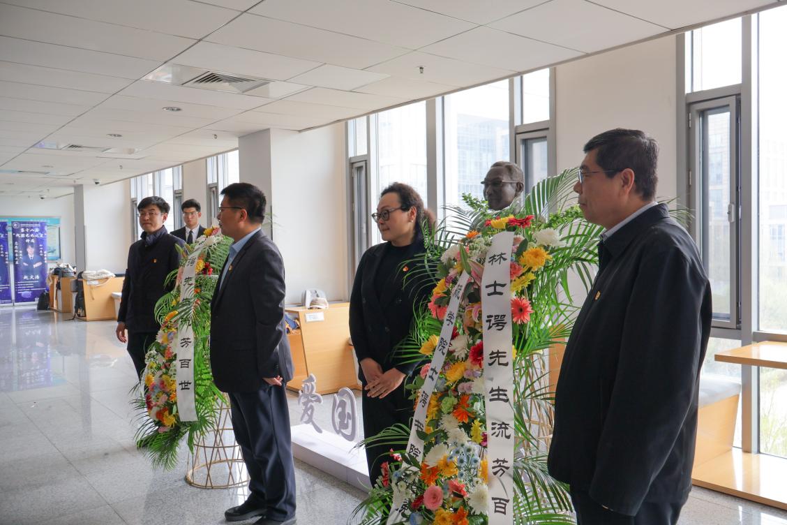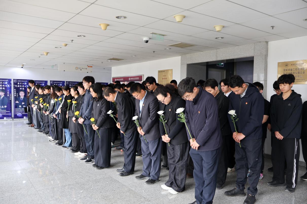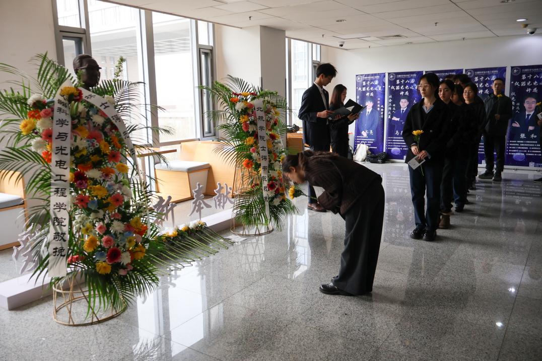 在学生代表张静轩和蒋旭航的深情献词中,樊尚春教授、雷晓锋老师、冀赵杰老师、丁丁老师缓步上前,向林士谔先生纪念像敬献花篮。随后,参与活动的师生依次近前瞻仰,敬献手中鲜花与追思卡片。一次简短的驻足,一次轻轻的俯身,将追思化作内心的沉淀,让缅怀成为前行的力量,完成了精神的接棒与延续。
